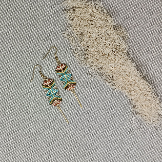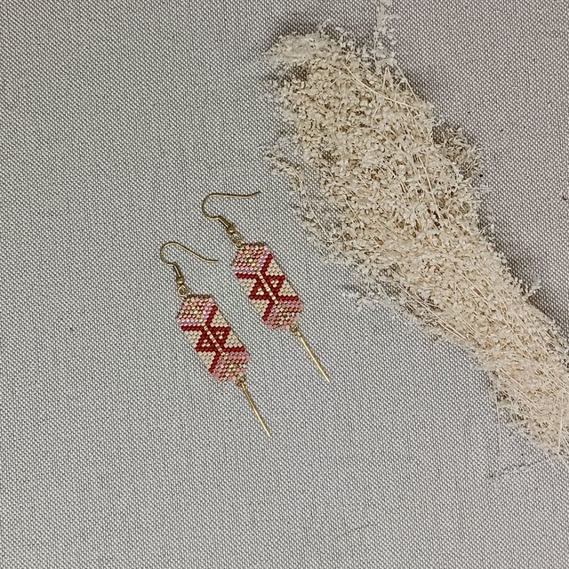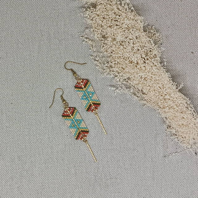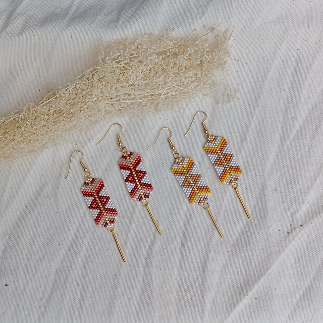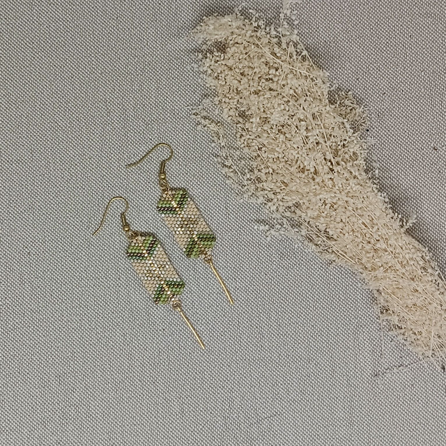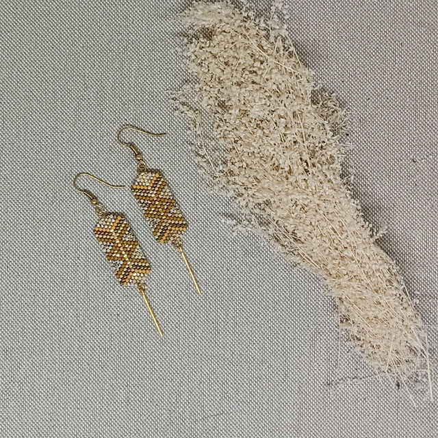 Boucles d'oreilles en perles de verre Miyuki tissées à l'aiguille, aux motifs géométriques hypnotisants! Elles sont ornées de fines tiges en métal doré à l'or fin.