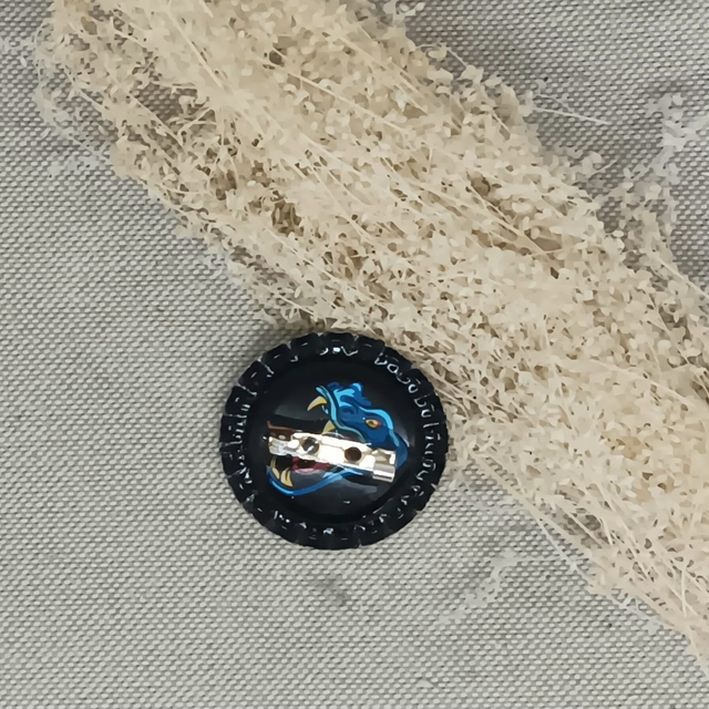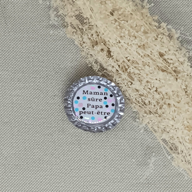 Badge humoristique réalisé à partir d'une capsule de bouteille recyclée.