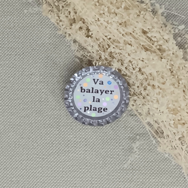 Badge humoristique réalisé à partir d'une capsule de bouteille recyclée.